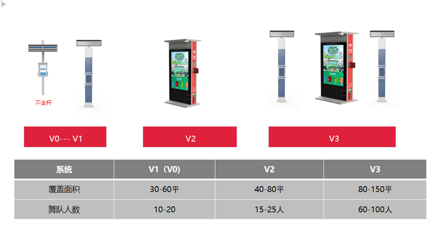 清聽聲學智慧廣場舞系統一共有4個型號:V0、V1、V2、V3,其中V0、V1是比較基礎的型號,不帶大屏幕,這2個型號的只能廣場舞系統只能通過插優盤來播放歌曲,優盤里面的歌曲曲目都可以自由選擇,數量多少也是自由決定,不是規定的曲目和數量,不是只能播放幾首歌曲。V2、V3是帶大屏幕的智慧廣場舞系統,這2個型號設備可以通過外接優盤來播放歌曲也可以通過手機小程序來播放自己想聽的音樂,V2、V3因為帶了大屏幕可以聯網,所以功能相對比V0、V1來說也是更多,因此播放歌曲的途徑也更多。