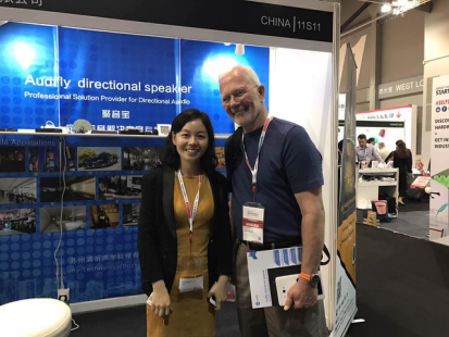 來自香港的toni lin高興地表示,聚音寶可以幫助他們解決商場外面音樂會的噪音問題;日本客戶說道,在廣告行業,聚音寶定向音響大有用武之地;來自美國一家公司的CEO Michael  Yap更是現場發出邀約。