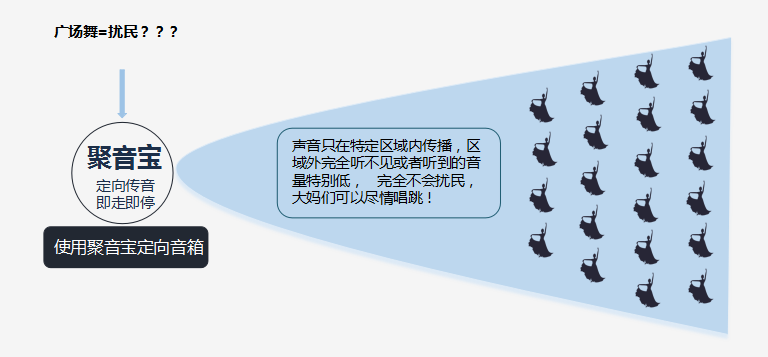 辦法六:使用專門的防干擾音響。使用傳說中的”廣場舞神器“——聚音寶定向音響, 這種音響能把聲音集中在一個特定的區域內,在區域內的人能聽見聲音,區域為則聽不見,或者聲音音量很低。這樣既不會產生噪音,又不影響舞者積極性,達到了強身健體不擾民的雙重目的。