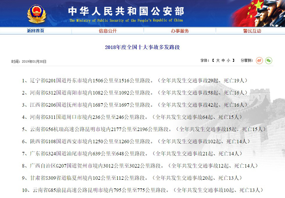 由于高速公路全程較長、路標單一、車流量大,長時間駕駛會讓司機產生心理急躁、思想混亂、精力分散、反應遲緩等不良表現。且途徑高速公路上下坡、長下坡、彎道、多隧道、多山路、養護維修等路段時,由于行車速度較快,非常容易造成側翻、撞擊、多車追尾等事故,遇上惡劣天氣,情況更加難以把控。針對2018年重大交通事故暴露出的問題,公安部發布了2018年度全國十大事故多發路段,其中9處均為高速公路,陜西省G108國道西安市境內1250公里至1260公里路段全年共發生交通事故102起,死亡14人;遼寧省G201國道丹東市境內1506公里至1516公里路段全年共發生交通事故29起,死亡19人……數字觸目驚心!